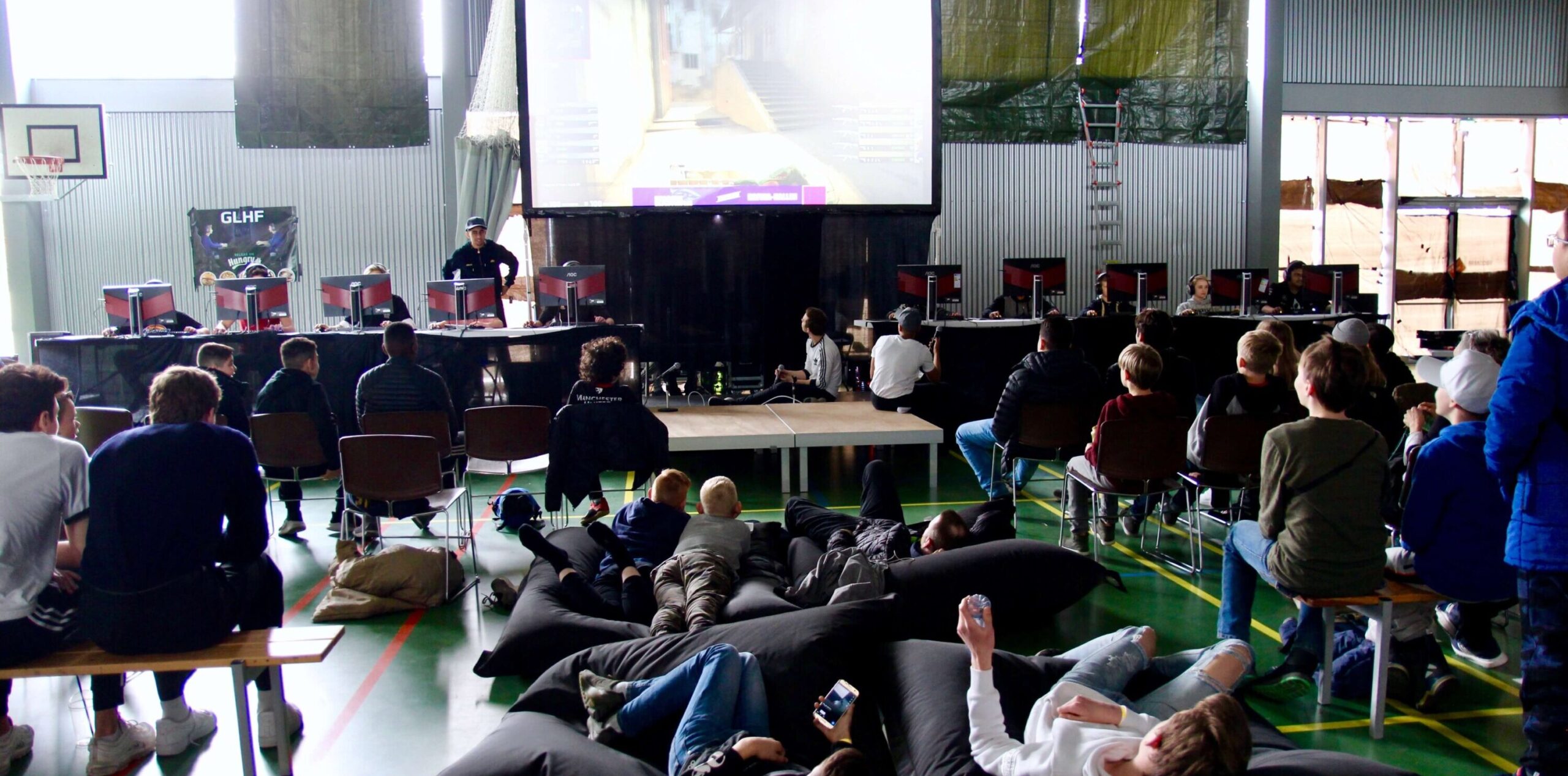 Storskærmen lyser blåt ned på bænkene og sækkestolene, som alle børnene og de unge har fundet sig til rette i. De kigger tilbage mod podiet og computerne, hvor de skal spille om sejren i turneringer i Counterstrike og Fortnite til Gamers Galaxy i Hafnia-Hallen.